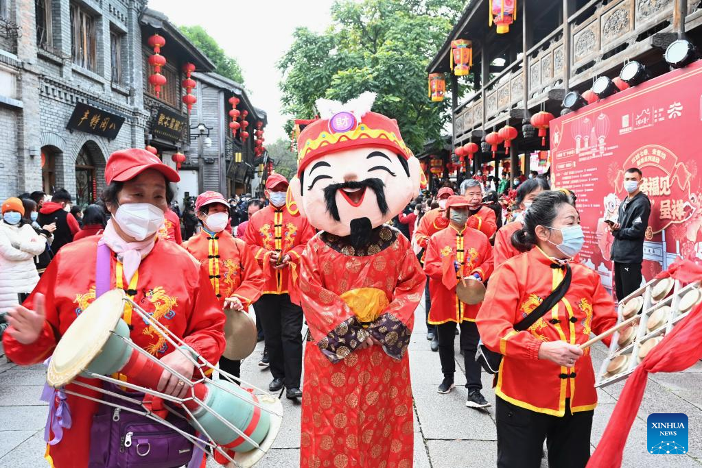 A staff member in the costume of the God of Wealth takes part in an event at a historic street in Nanning, south China's Guangxi Zhuang Autonomous Region, Jan. 26, 2023. Ceremonies were held to welcome the God of Wealth as a tradition on the fifth day of the Chinese Lunar New Year, which falls on Thursday this year. (Photo by Yu Xiangquan/Xinhua)