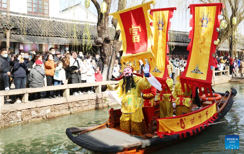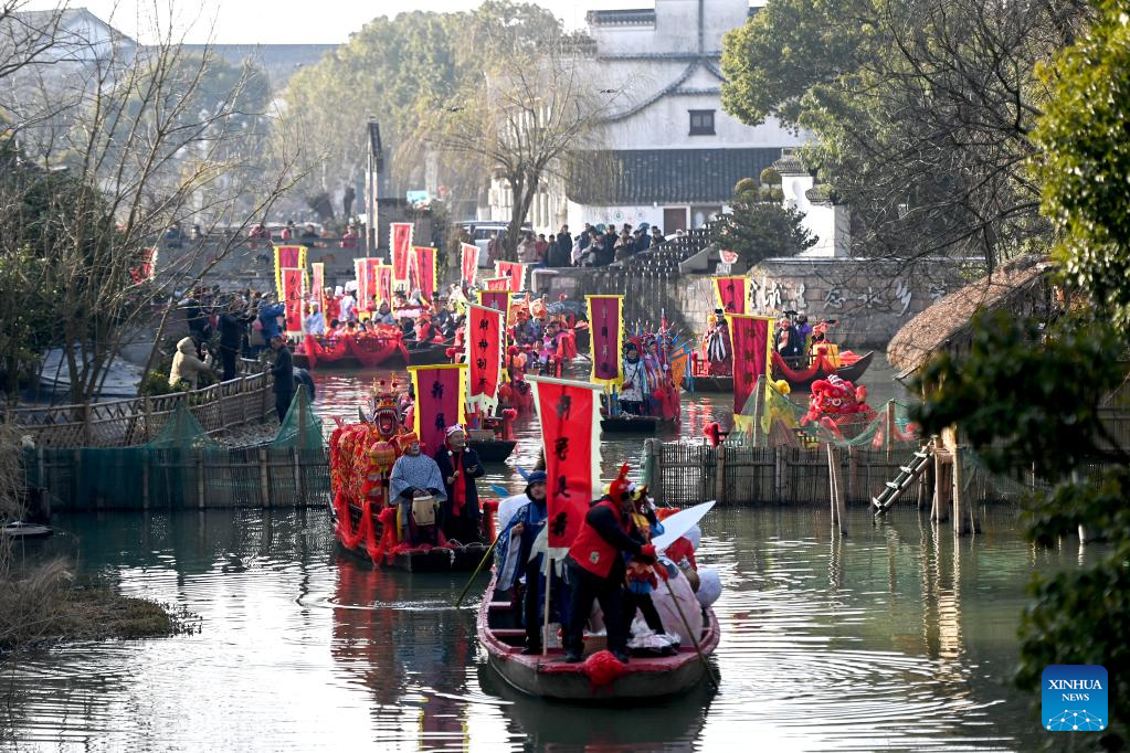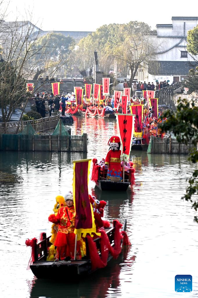 People take part in a parade welcoming the God of Wealth along waterways at Digang Village in Huzhou, east China's Zhejiang Province, Jan. 26, 2023. Ceremonies were held to welcome the God of Wealth as a tradition on the fifth day of the Chinese Lunar New Year, which falls on Thursday this year. (Xinhua/Huang Zongzhi)