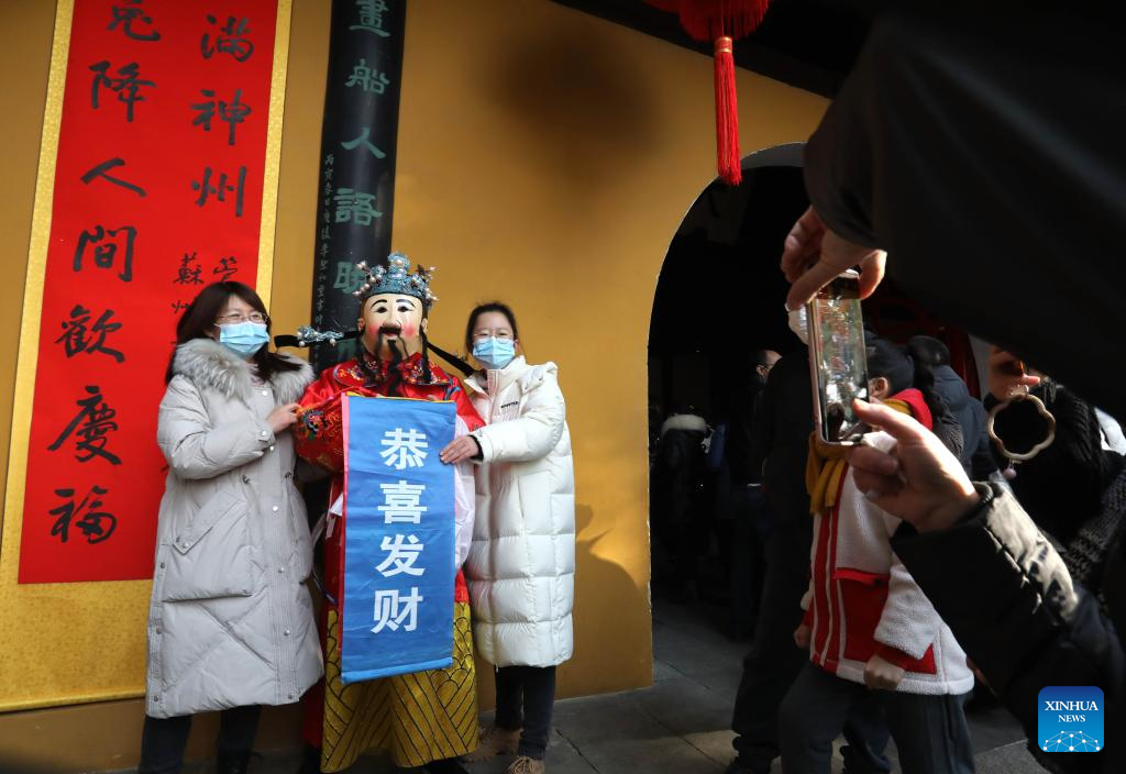 A staff member in the costume of the God of Wealth poses for photos with tourists at a scenic spot in Suzhou, east China's Jiangsu Province, Jan. 26, 2023. Ceremonies were held to welcome the God of Wealth as a tradition on the fifth day of the Chinese Lunar New Year, which falls on Thursday this year. (Photo by Hang Xingwei/Xinhua)