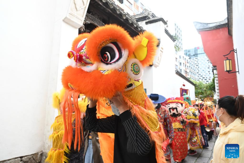 People take part in a parade welcoming the God of Wealth at Sanfangqixiang (Three Lanes and Seven Alleys), an ancient block in downtown Fuzhou, southeast China's Fujian Province, Jan. 26, 2023. Ceremonies were held to welcome the God of Wealth as a tradition on the fifth day of the Chinese Lunar New Year, which falls on Thursday this year. (Xinhua/Lin Shanchuan)