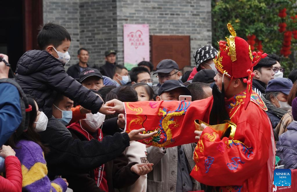 A staff member in the costume of the God of Wealth interacts with tourists at Sanfangqixiang (Three Lanes and Seven Alleys), an ancient block in downtown Fuzhou, southeast China's Fujian Province, Jan. 26, 2023. Ceremonies were held to welcome the God of Wealth as a tradition on the fifth day of the Chinese Lunar New Year, which falls on Thursday this year. (Xinhua/Lin Shanchuan)
