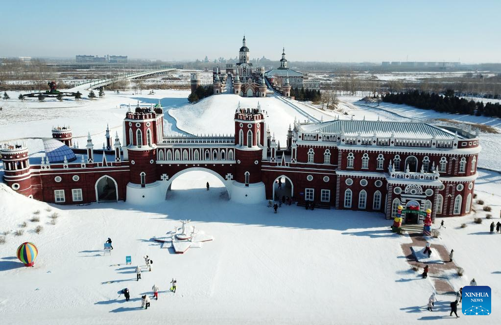 The aerial photo taken on Jan. 26, 2023 shows people visiting the Volga Manor in Harbin, northeast China's Heilongjiang Province. Heilongjiang has attracted legions of tourists during the Spring Festival holiday. (Xinhua/Wang Jianwei)