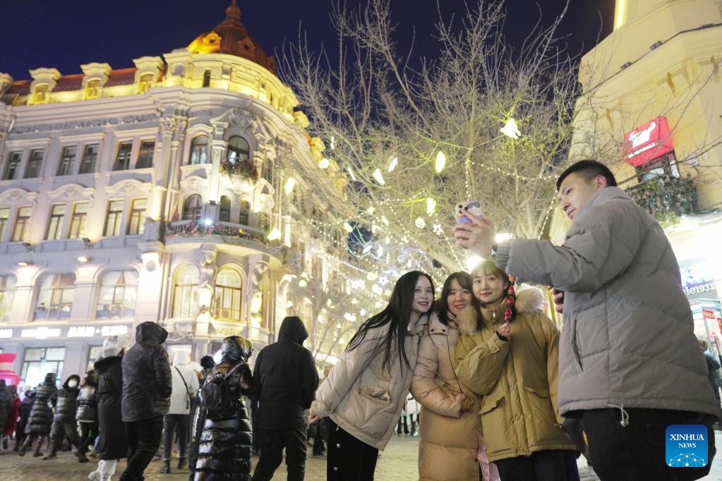 Tourists take photos at the Central Street in Harbin, northeast China's Heilongjiang Province, Jan. 25, 2023. Heilongjiang has attracted legions of tourists during the Spring Festival holiday. (Xinhua/Wang Jianwei)