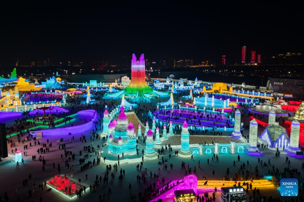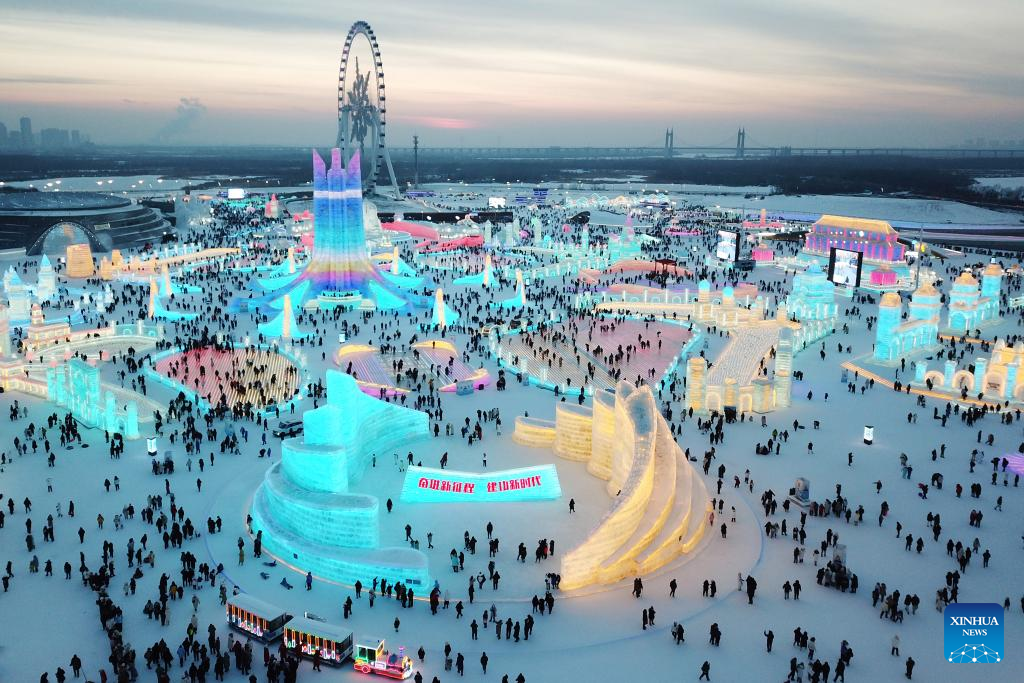 The aerial photo taken on Jan. 25, 2023 shows the Harbin Ice and Snow World in Harbin, northeast China's Heilongjiang Province. Heilongjiang has attracted legions of tourists during the Spring Festival holiday. (Xinhua/Zhang Tao)