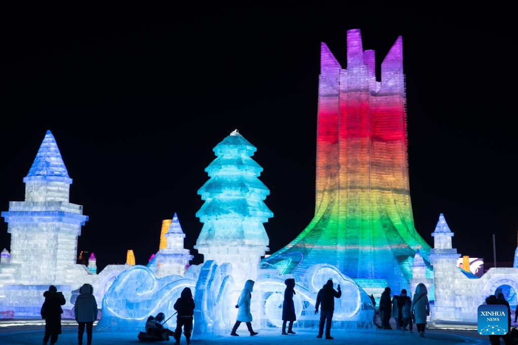 Tourists have fun at the Harbin Ice and Snow World in Harbin, northeast China's Heilongjiang Province, Jan. 24, 2023. Heilongjiang has attracted legions of tourists during the Spring Festival holiday. (Xinhua/Zhang Tao)