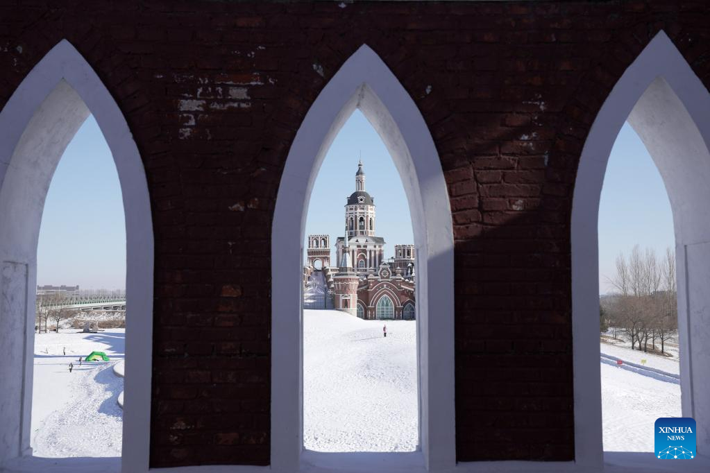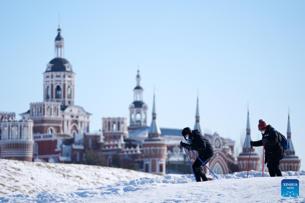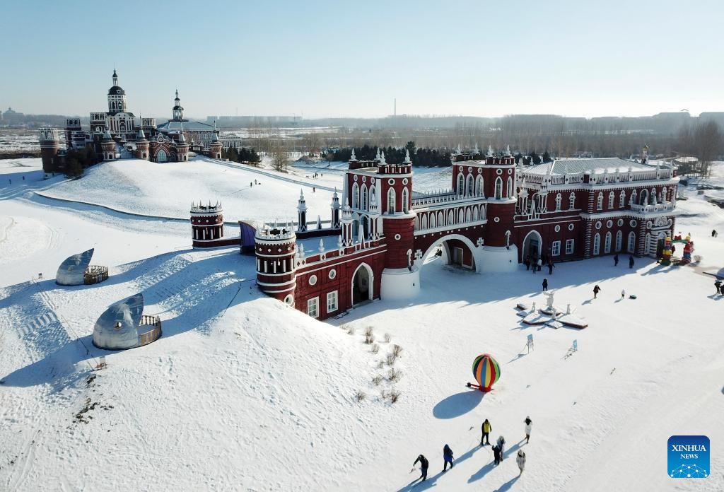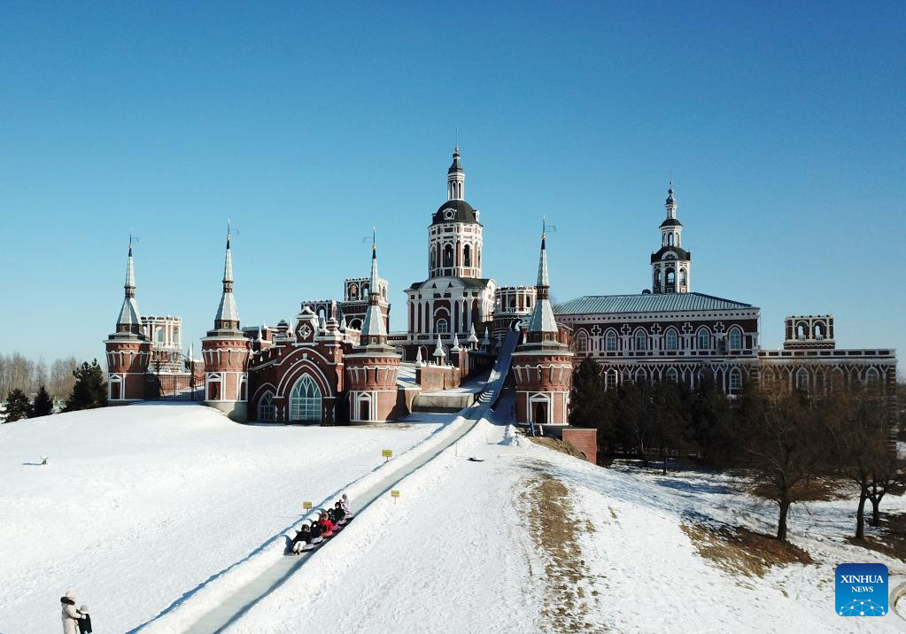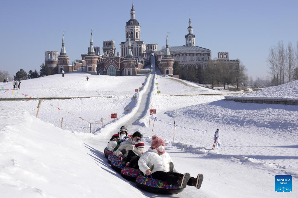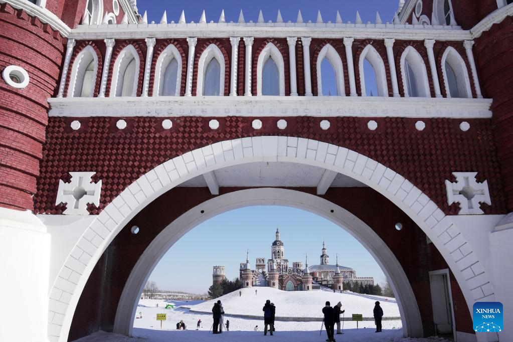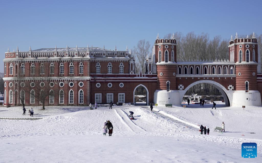 People ski at the Volga Manor in Harbin, northeast China's Heilongjiang Province, Jan. 26, 2023. The Volga Manor, a Russian culture-themed park, turned into an ice and snow world during the Spring Festival, attracting lots of visitors. (Xinhua/Wang Jianwei)