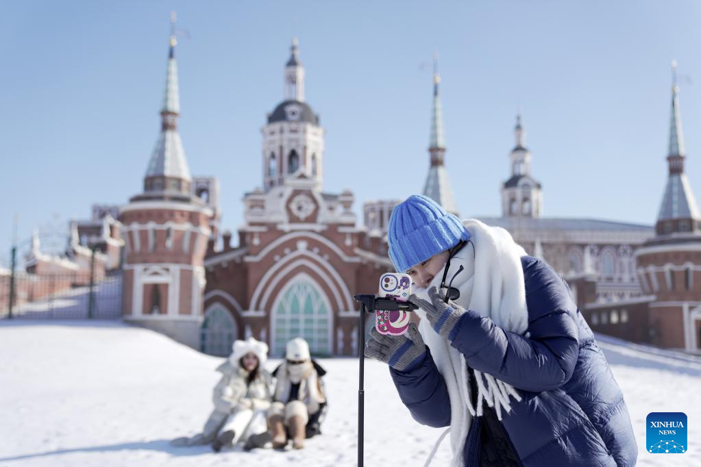 A tourist takes photos at the Volga Manor in Harbin, northeast China's Heilongjiang Province, Jan. 26, 2023. The Volga Manor, a Russian culture-themed park, turned into an ice and snow world during the Spring Festival, attracting lots of visitors. (Xinhua/Wang Jianwei)