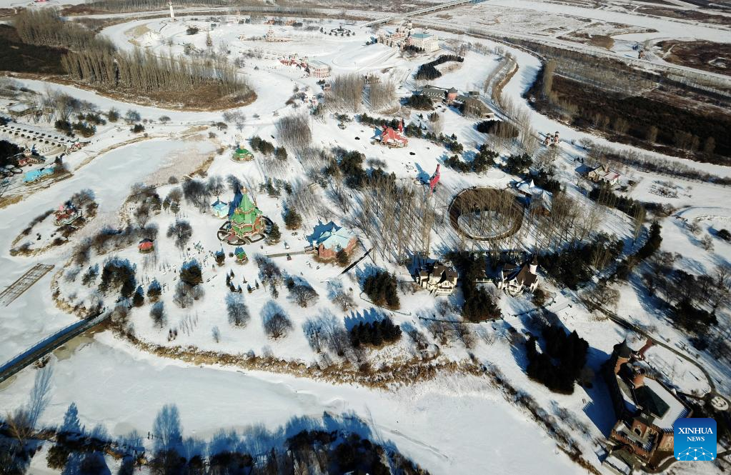 This aerial photo taken on Jan. 26, 2023 shows part of the Volga Manor in Harbin, northeast China's Heilongjiang Province. The Volga Manor, a Russian culture-themed park, turned into an ice and snow world during the Spring Festival, attracting lots of visitors. (Xinhua/Wang Jianwei)
