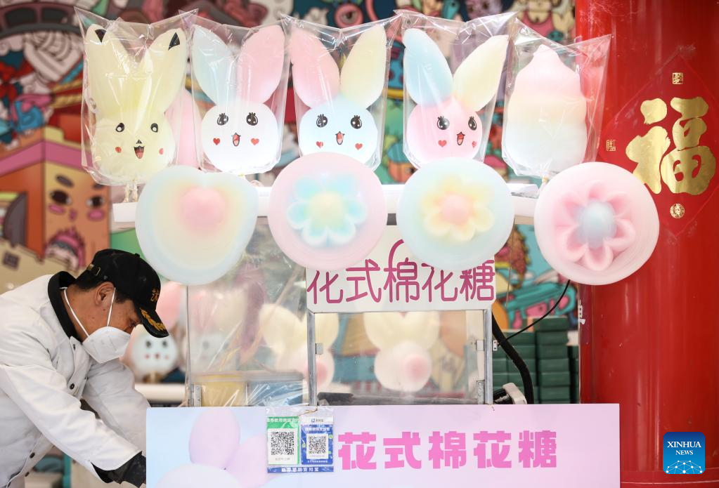A craftsman makes cotton candy in the shape of rabbits at the Nanluoguxiang Lane in Beijing, capital of China, Jan. 27, 2023. People enjoy the last day of the Spring Festival holiday on Friday. (Xinhua/Lan Hongguang)