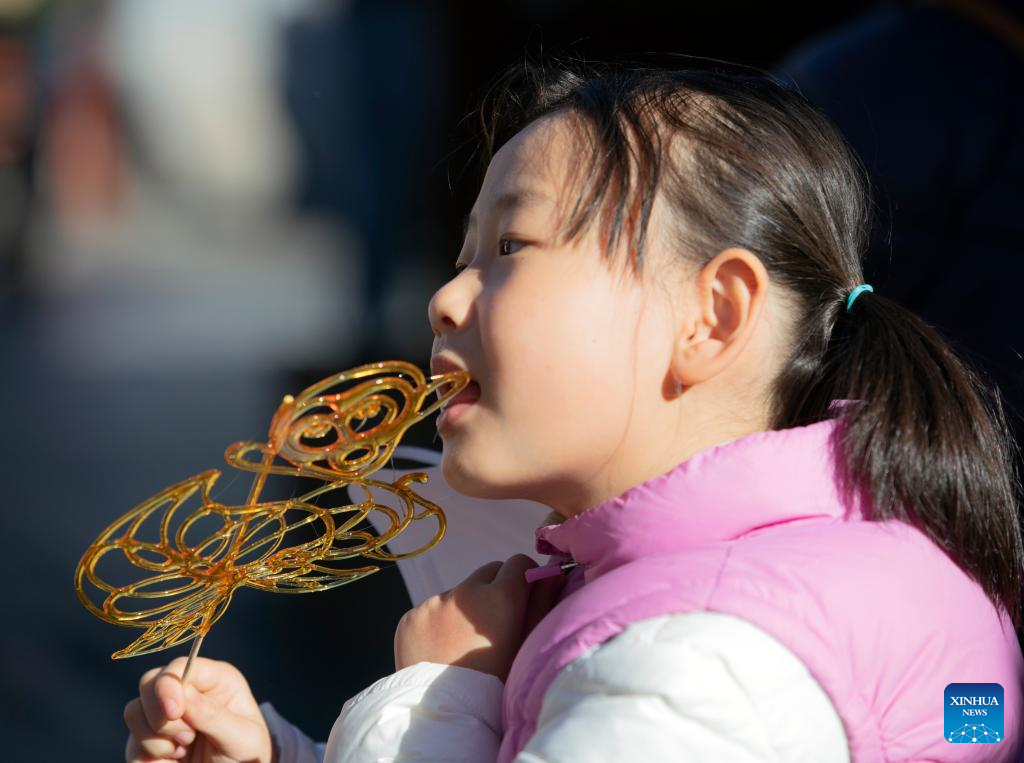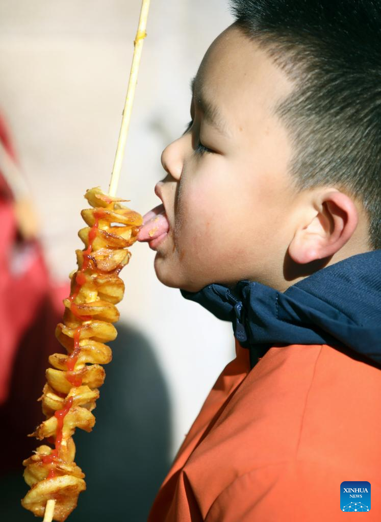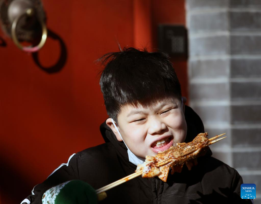 A child enjoys food at the Nanluoguxiang Lane in Beijing, capital of China, Jan. 27, 2023. People enjoy the last day of the Spring Festival holiday on Friday. (Xinhua/Lan Hongguang)