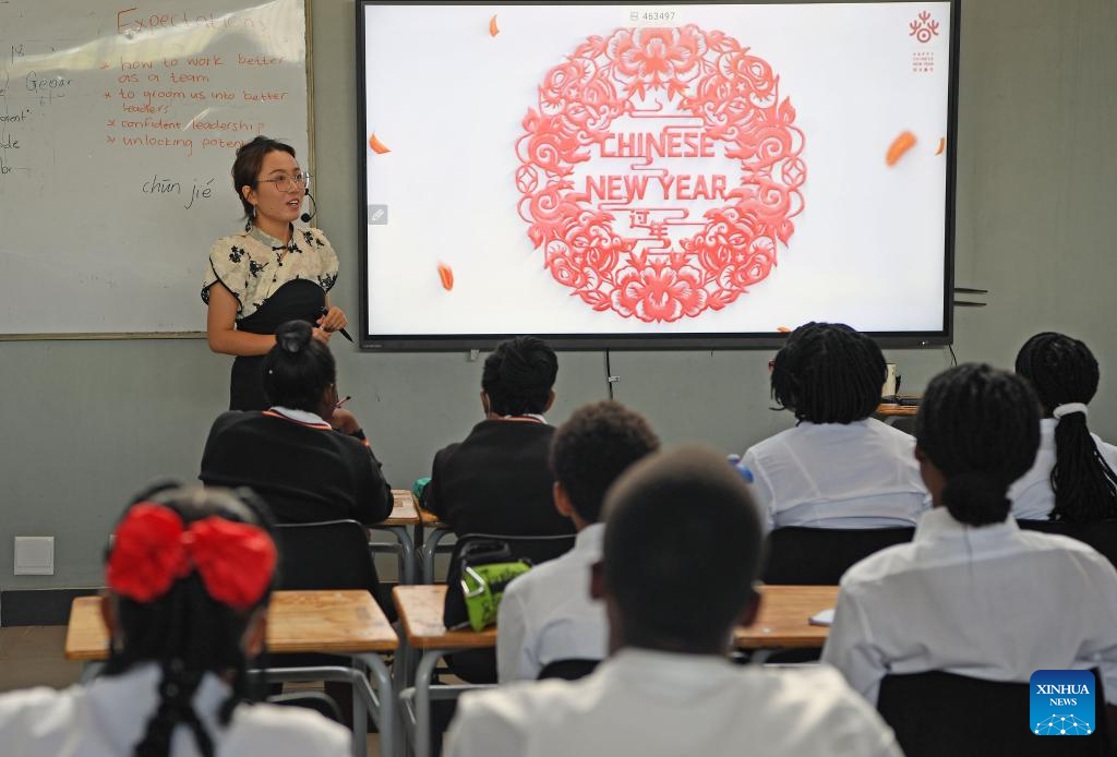 A Chinese lecturer from the Confucius Institute at the University of Namibia gives a lecture on traditions related to the Chinese New Year in Windhoek, Namibia, Jan. 27, 2023. The Confucius Institute at the University of Namibia on Friday acquainted local students with traditions related to the Chinese New Year, or the Spring Festival. (Photo by Musa C Kaseke/Xinhua)