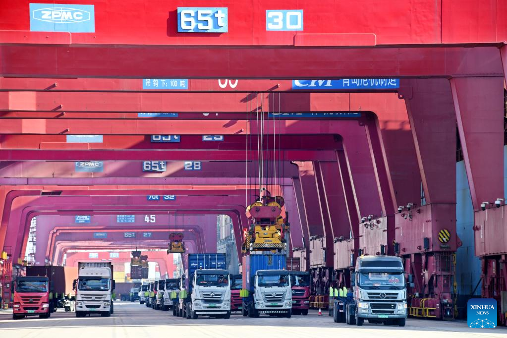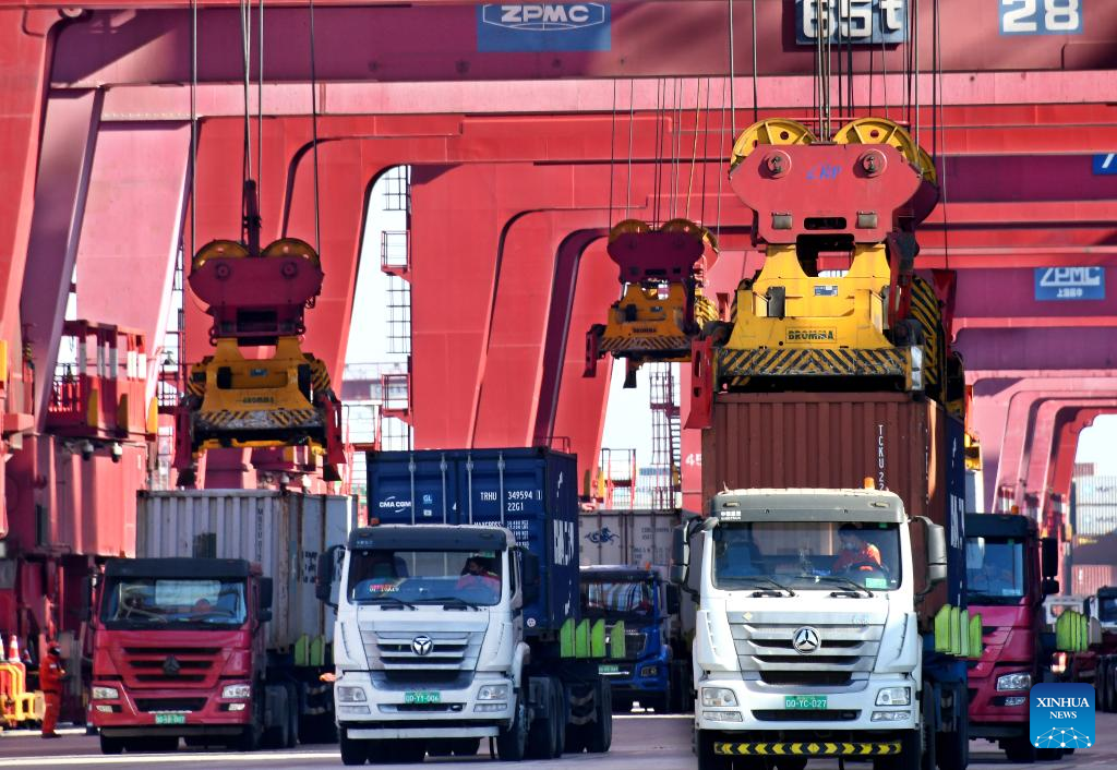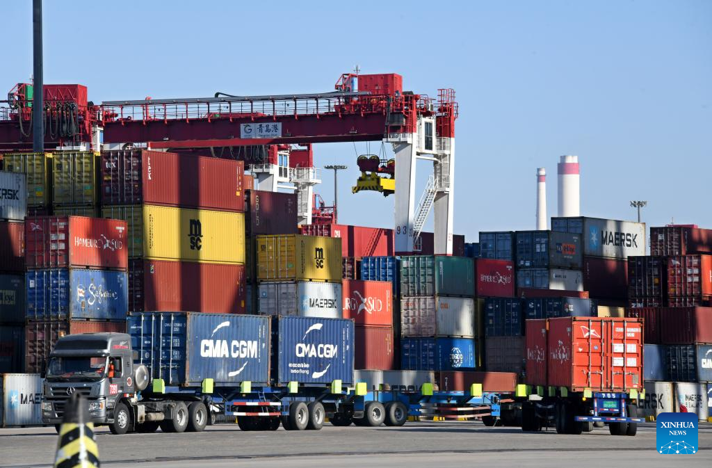 Trucks transport containers at Qianwan Container Terminal of Qingdao Port in east China's Shandong Province, Jan. 27, 2023. (Xinhua/Li Ziheng)