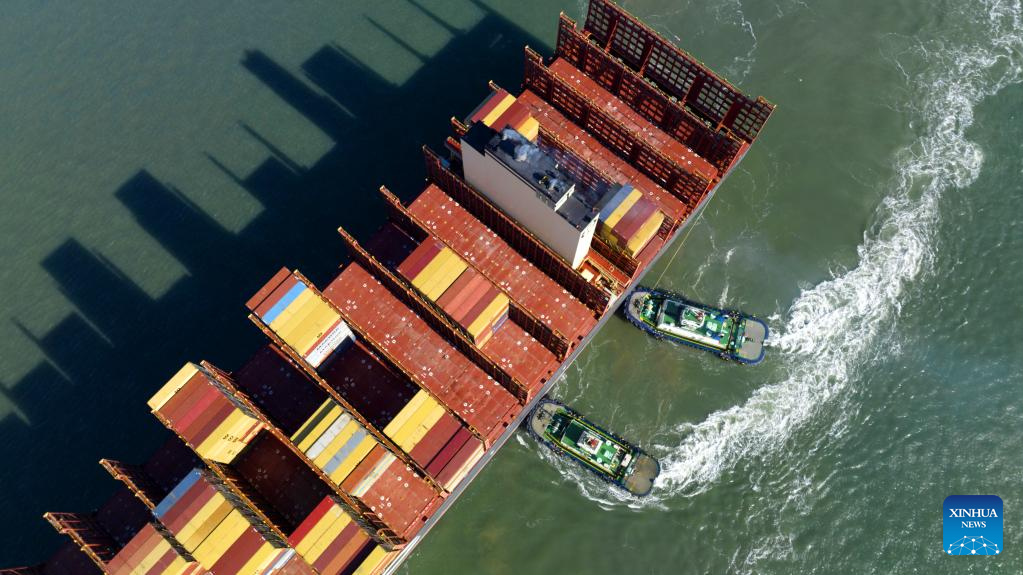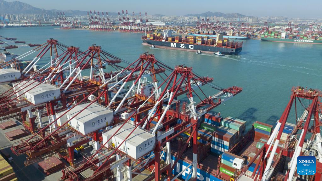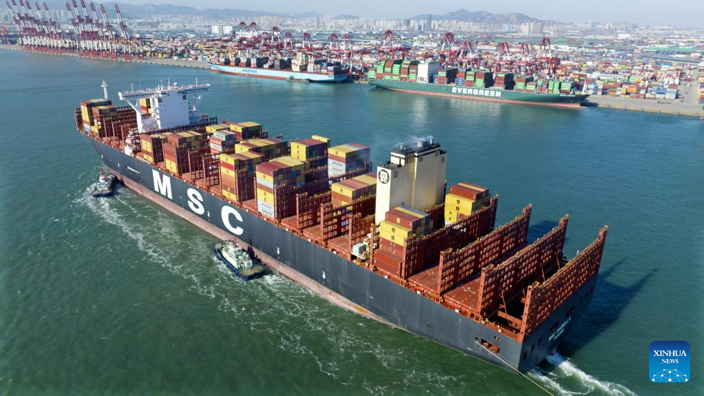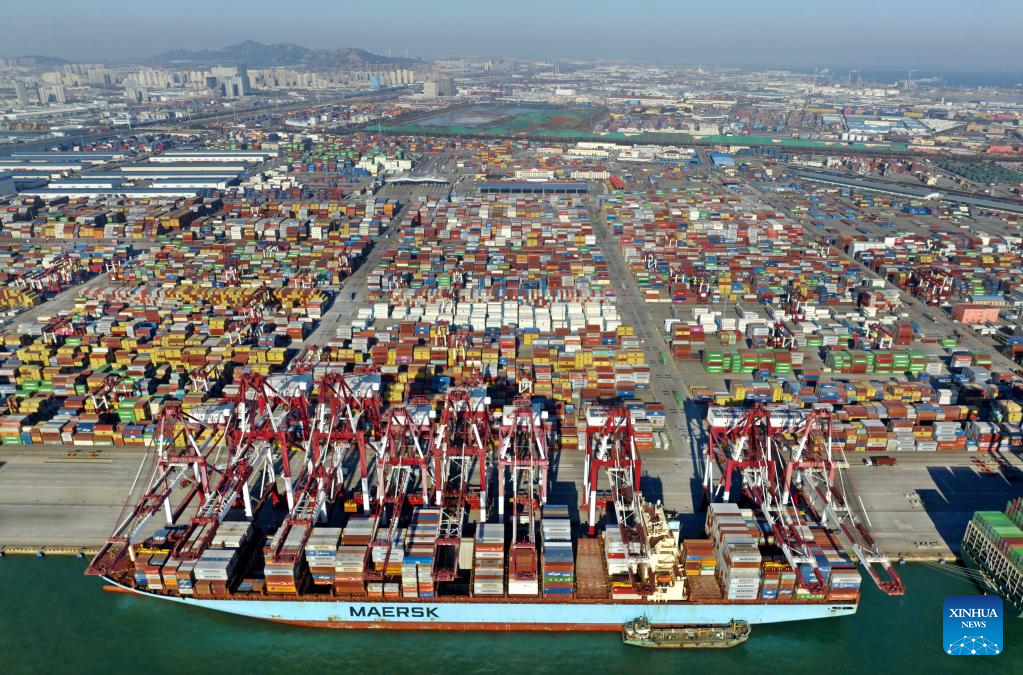 A container ship sails to Qianwan Container Terminal of Qingdao Port in east China's Shandong Province, Jan. 27, 2023. (Xinhua/Li Ziheng)