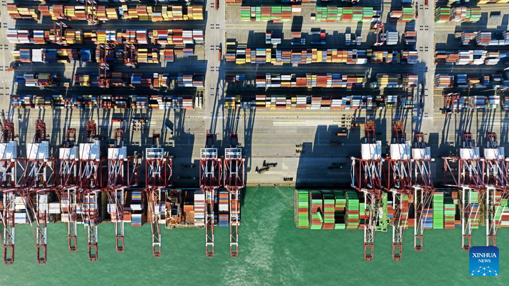 This aerial photo taken on Jan. 27, 2023 shows the Qianwan Container Terminal of Qingdao Port in east China's Shandong Province. (Xinhua/Li Ziheng)