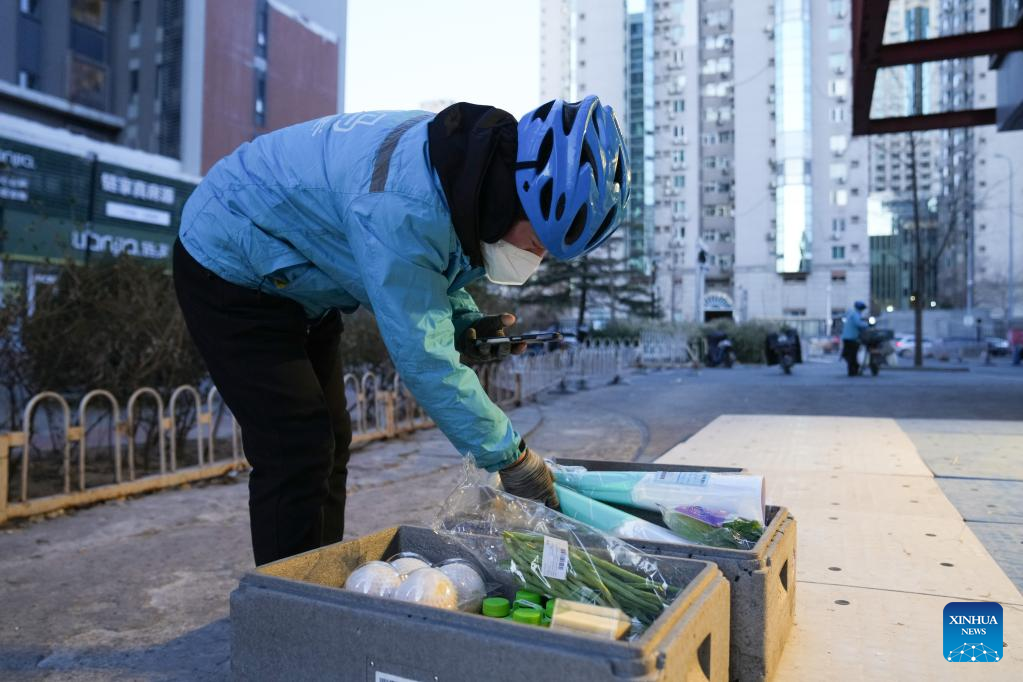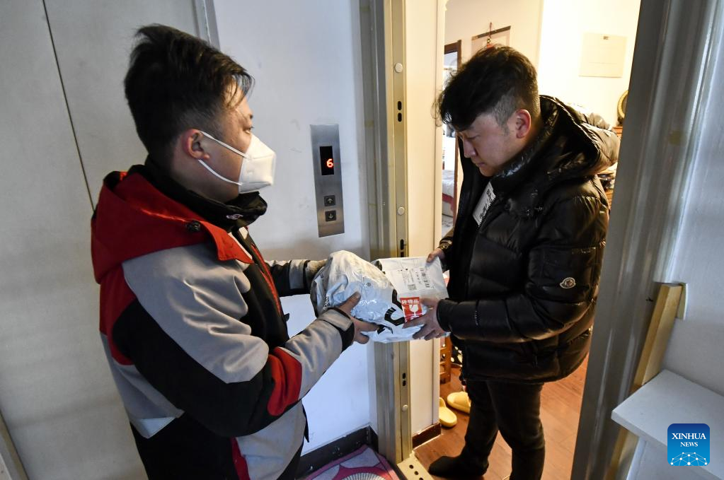 Delivery man Jiang Shuangjian delivers the first package on the first working day after the Spring Festival holiday in Chaoyang District of Beijing, capital of China, Jan. 28, 2023. Saturday marked the first day of work after the Spring Festival holiday in China. (Xinhua/Li Xin)