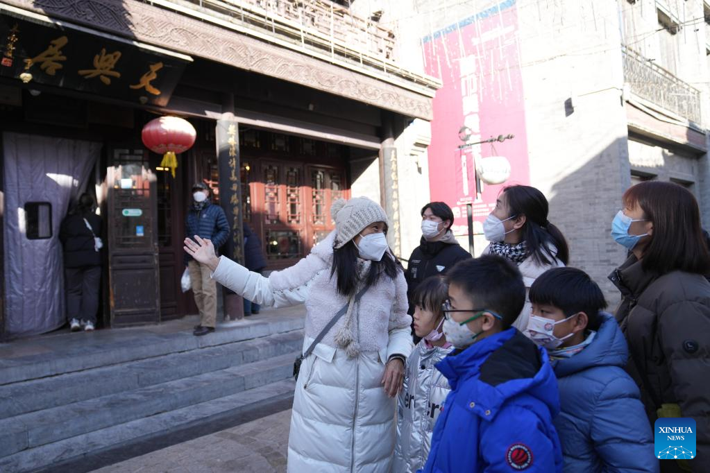 Tour guide He Jing (1st L) introduces scenic spots to tourists on the first working day after the Spring Festival holiday in Dongcheng District of Beijing, capital of China, Jan. 28, 2023. Saturday marked the first day of work after the Spring Festival holiday in China. (Xinhua/Ju Huanzong)