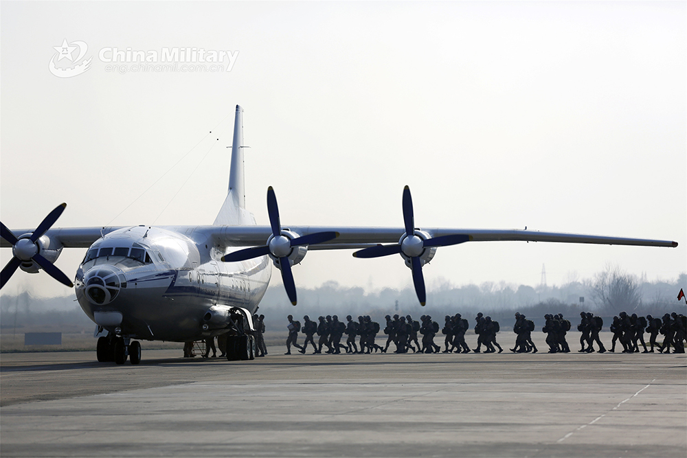 Recruits assigned to an airborne unit of the PLA Air Force queue up for boarding a transport plane before a parachuting training exercise in mid-January, 2023. (eng.chinamil.com.cn/Photo by Sheng Chao)