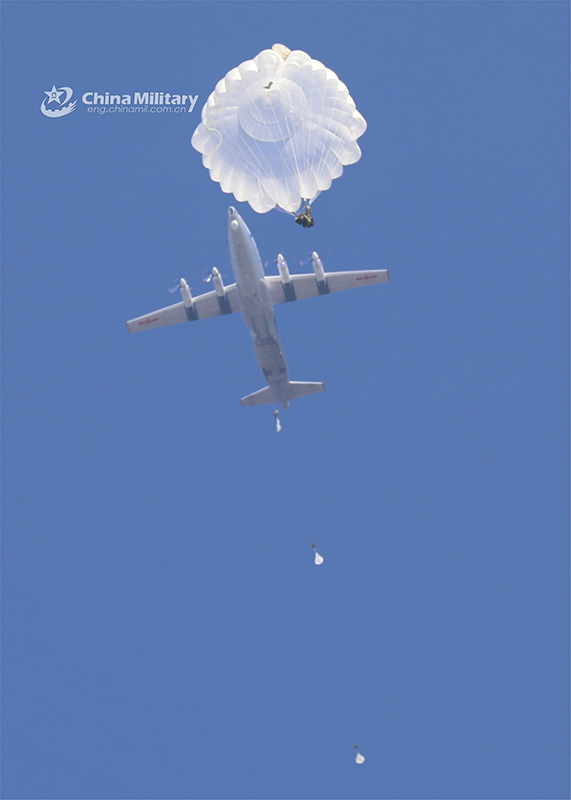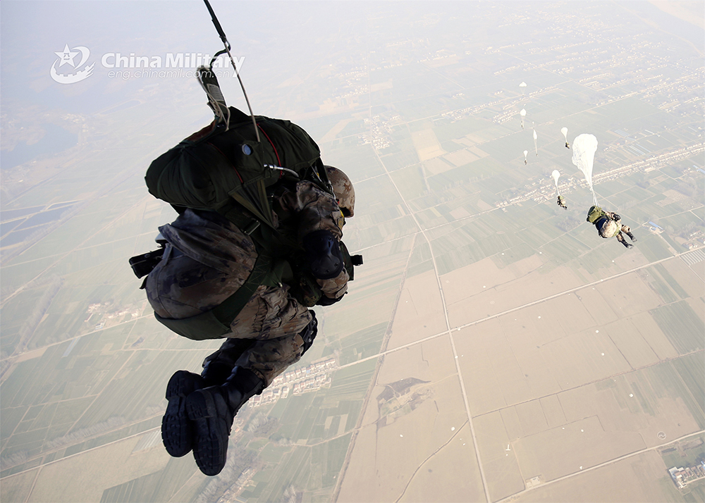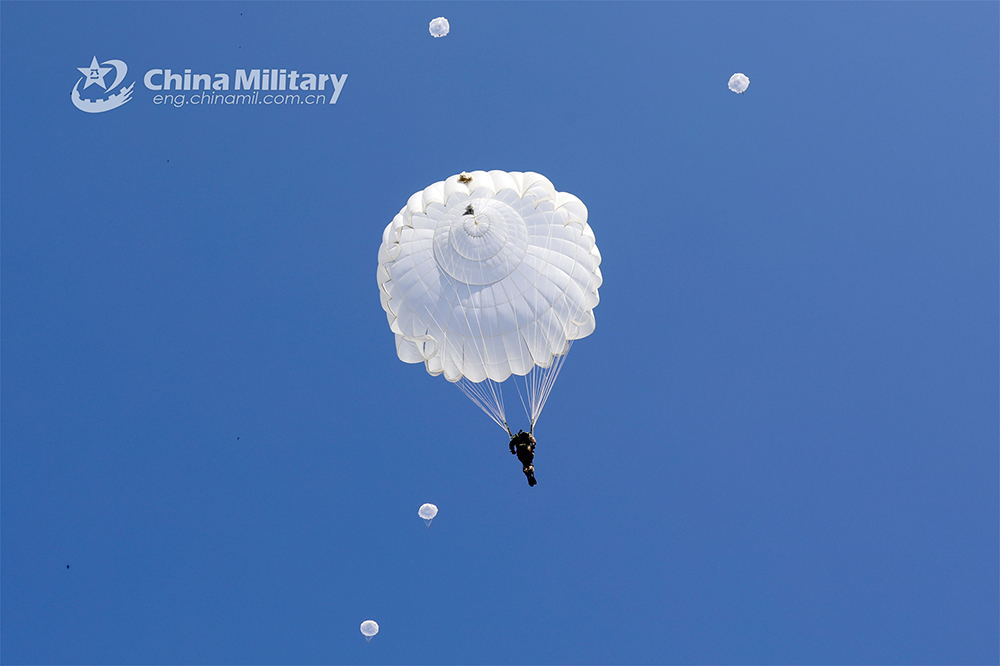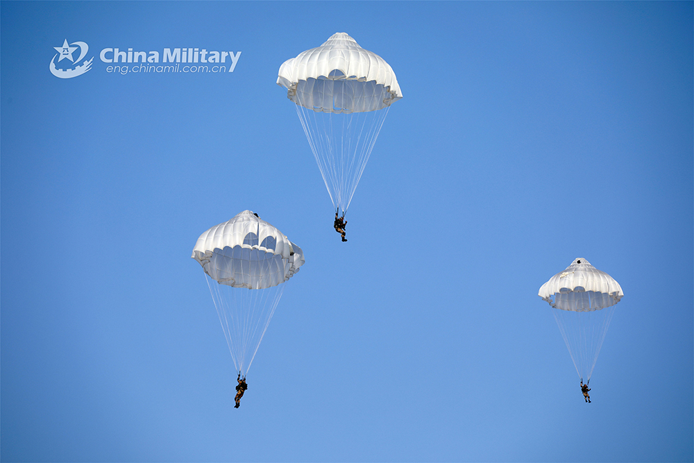 Recruits assigned to an airborne unit of the PLA Air Force descend to the drop zone during a parachuting training exercise in mid-January, 2023. (eng.chinamil.com.cn/Photo by Sheng Chao)