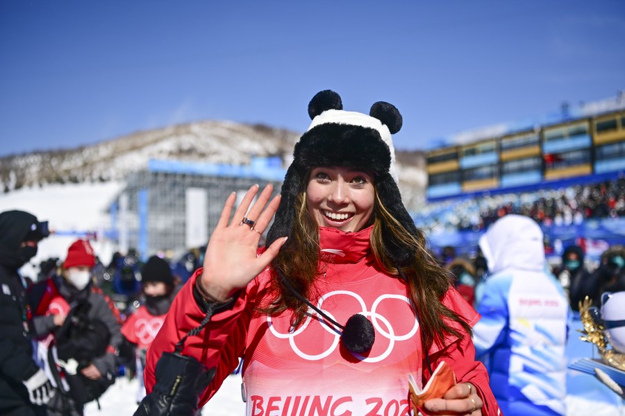 Gu Ailing reacts after the freestyle skiing women's freeski halfpipe final of the Beijing 2022 Winter Olympics at Genting Snow Park in Zhangjiakou, north China's Hebei Province, Feb. 18, 2022. (Xinhua/Zhang Hongxiang)