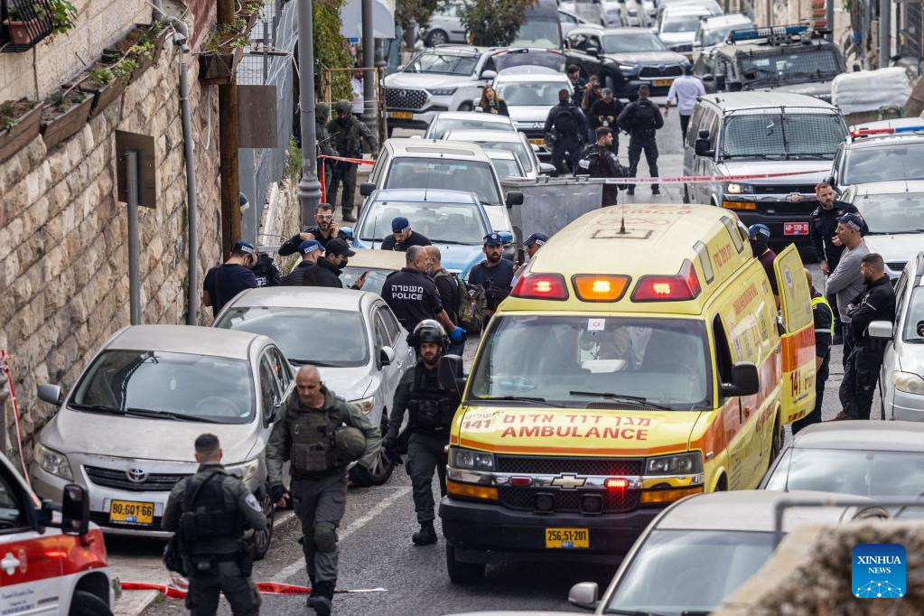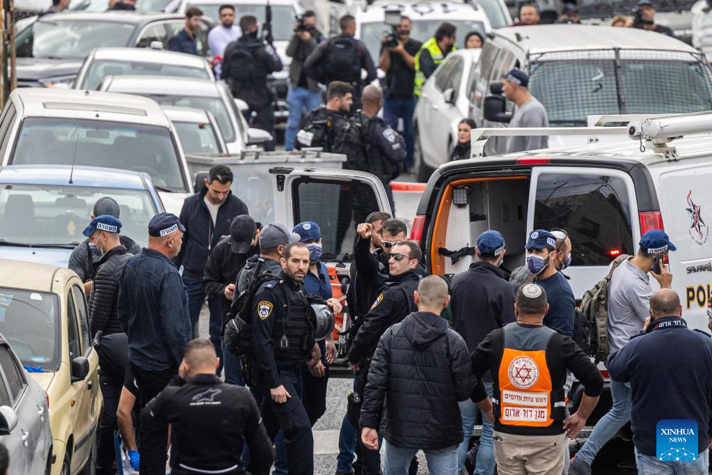 Israeli police and rescue personnel are seen at the scene of a shooting attack near the Old City of Jerusalem, on Jan. 28, 2023. Two Israelis were injured in a shooting attack near the Old City of Jerusalem on Saturday morning, the Israeli police said. Saturday's attack comes just after a Palestinian shooter killed seven Israelis and wounded three others in a settlement in East Jerusalem on Friday night. In recent days, tensions between Israelis and Palestinians have been running high. (JINI via Xinhua)