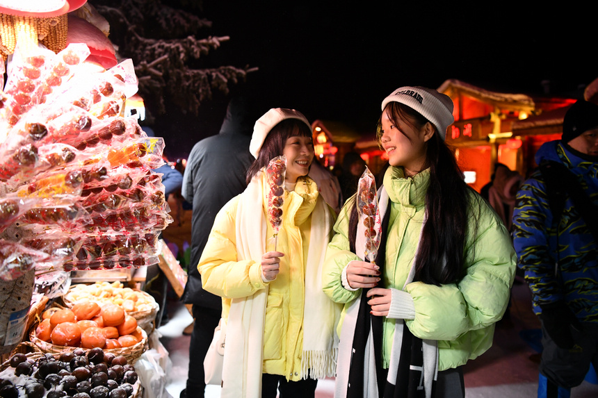 Tourists buy "Tanghulu," a kind of sugar-coated snack, in the Snow Town scenic area. (Photo courtesy of the Snow Town scenic area) |