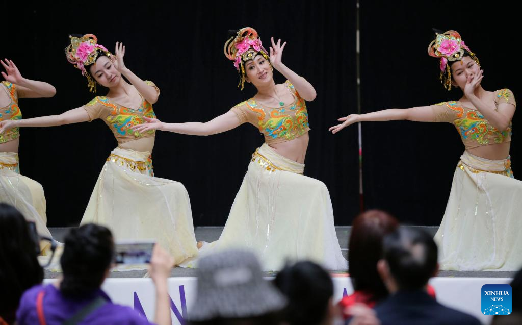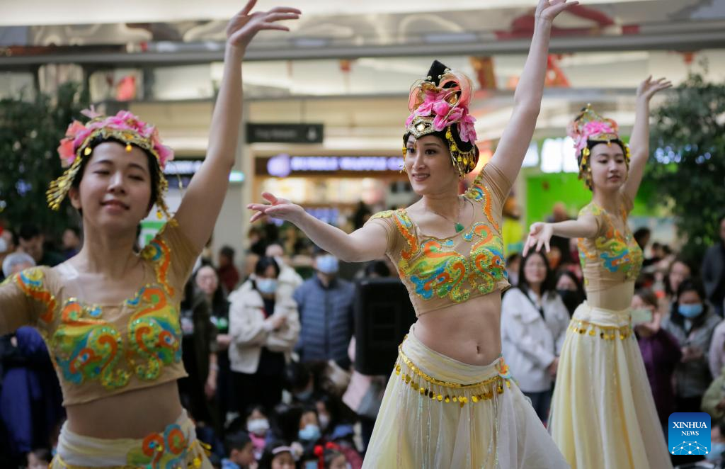 Dancers perform during the Chinese New Year celebration event at Lansdowne Centre in Richmond, British Columbia, Canada, Jan. 28, 2023. The event features a wide variety of cultural activities that allow the audience to experience the traditional culture of the Chinese New Year. (Photo by Liang Sen/Xinhua)