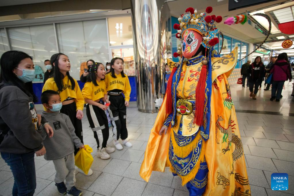 A performer in costume prepares to perform during the Chinese New Year celebration event at Lansdowne Centre in Richmond, British Columbia, Canada, Jan. 28, 2023. The event features a wide variety of cultural activities that allow the audience to experience the traditional culture of the Chinese New Year. (Photo by Liang Sen/Xinhua)