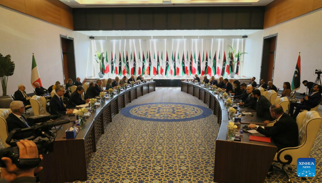 A visiting Italian delegation, headed by Prime Minister Giorgia Meloni, meets with the Libyan government officials in the Libyan capital Tripoli on Jan. 28, 2023. A visiting Italian delegation headed by Prime Minister Giorgia Meloni on Saturday signed agreements on enhancing cooperation in various fields with Libya in the Libyan capital Tripoli. (Photo by Hamza Turkia/Xinhua)