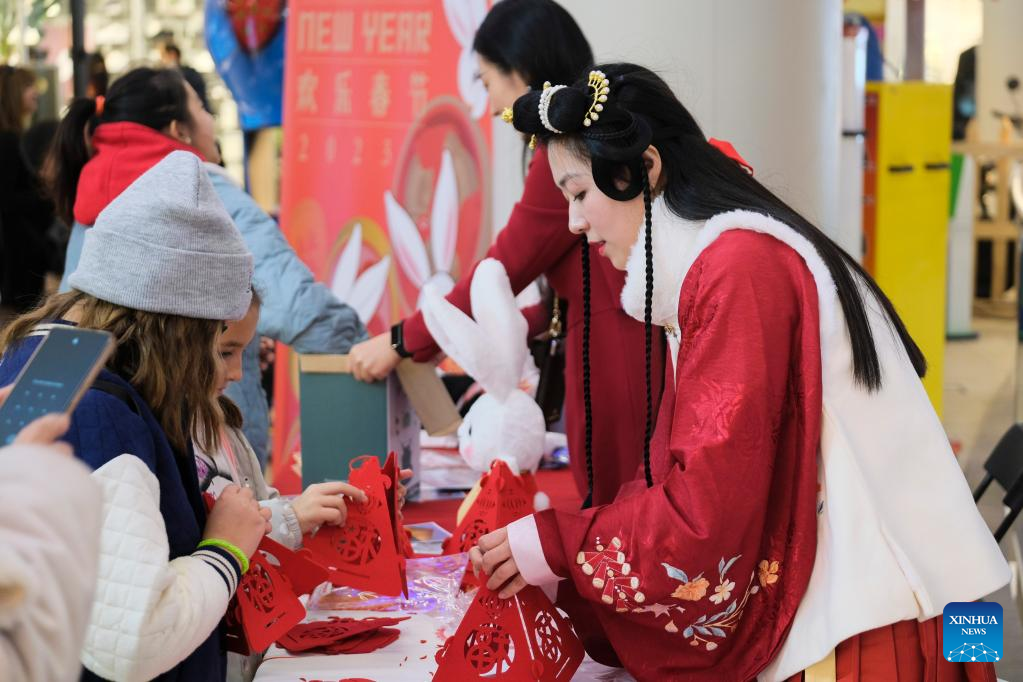 Children paint rabbits with Chinese brushes in Sliema, Malta, Jan. 28, 2023. An event to celebrate the Chinese New Year or Spring Festival was held in a shopping mall in Sliema on Saturday. (Photo by Jonathan Borg/Xinhua)