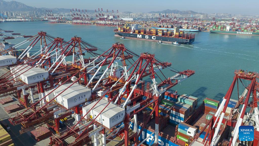 This aerial photo taken on Jan. 27, 2023 shows the Qianwan Container Terminal of Qingdao Port in east China's Shandong Province. (Xinhua/Li Ziheng)