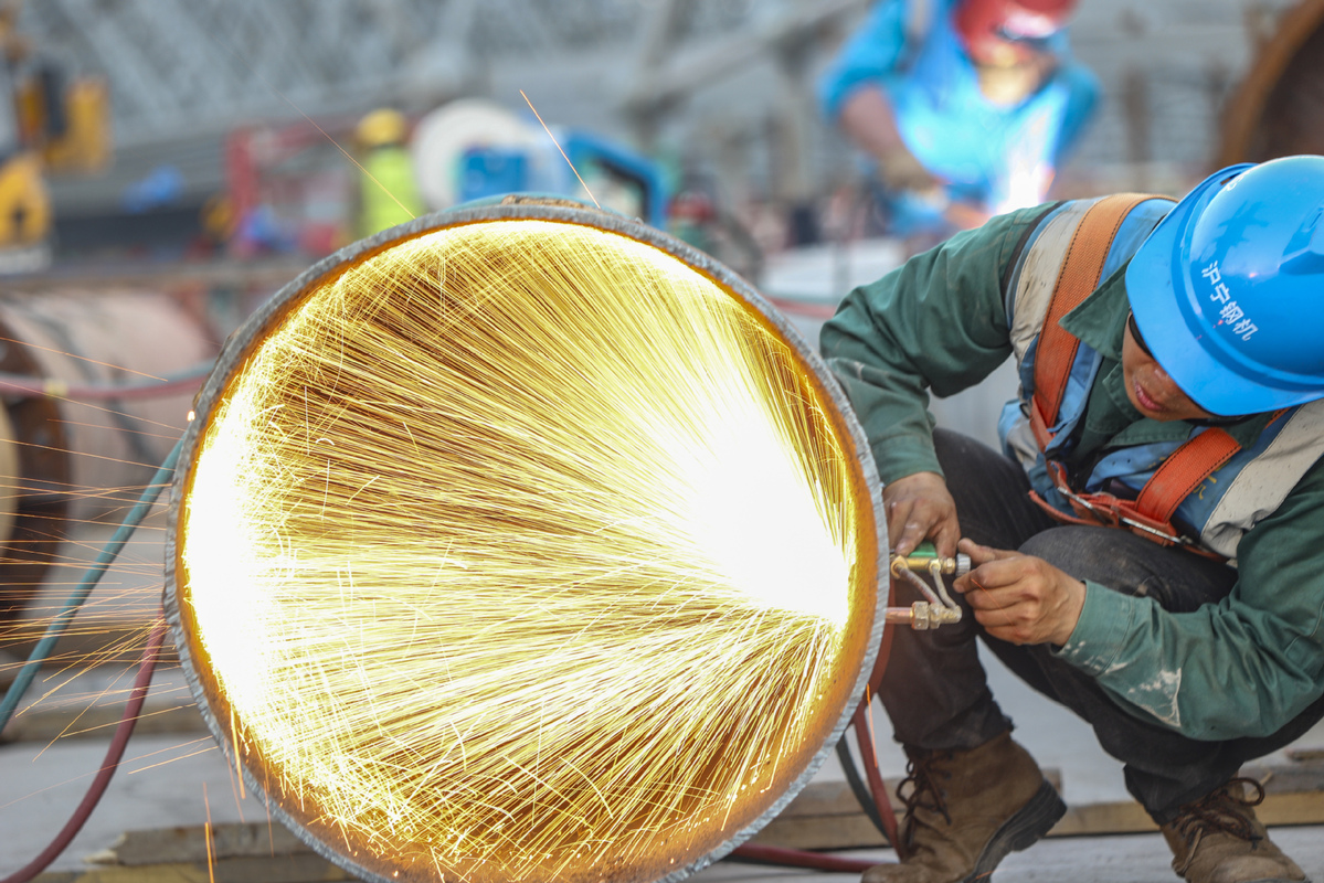A worker cuts a steel part at the construction site of the T3B terminal project of Chongqing Jiangbei International Airport in Southwest China's Chongqing, July 11, 2022. [Photo/Xinhua]