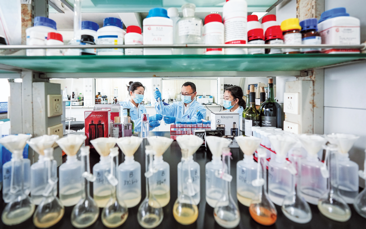 The testing personnel of Haikou Customs Technology Center carry out experimental treatment on duty-free cosmetics on Dec 15, 2022. ZHANG MAO/FOR CHINA DAILY