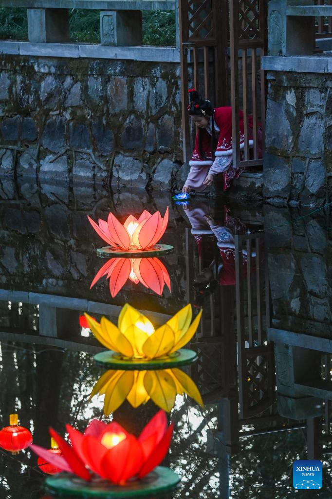A tourist dressed in traditional Chinese costume releases a water lantern at Aoshan Lantern Festival in Xincheng ancient town of Xiuzhou District in Jiaxing, east China's Zhejiang Province, Jan. 29, 2023. The Aoshan Lantern Festival, which has a history of hundreds of years, kicked off here on Sunday. (Xinhua/Xu Yu)