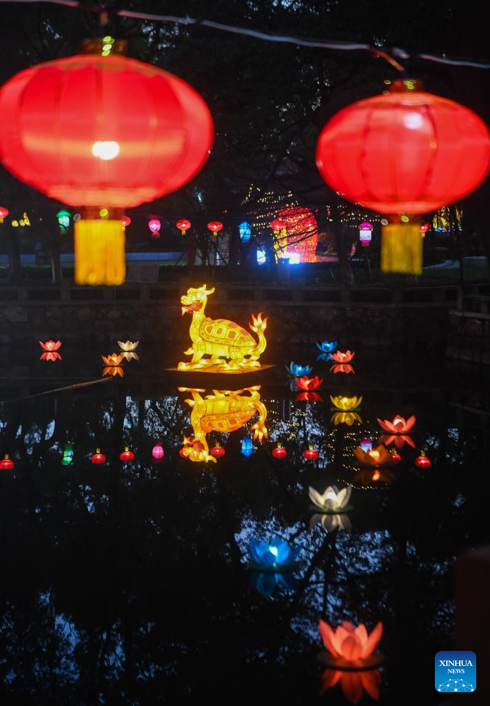 This photo taken on Jan. 29, 2023 shows lanterns at Aoshan Lantern Festival in Xincheng ancient town of Xiuzhou District in Jiaxing, east China's Zhejiang Province. The Aoshan Lantern Festival, which has a history of hundreds of years, kicked off here on Sunday. (Xinhua/Xu Yu)