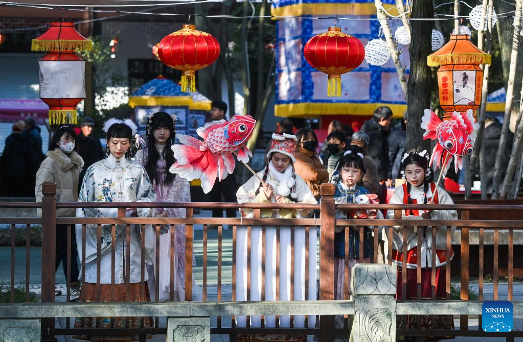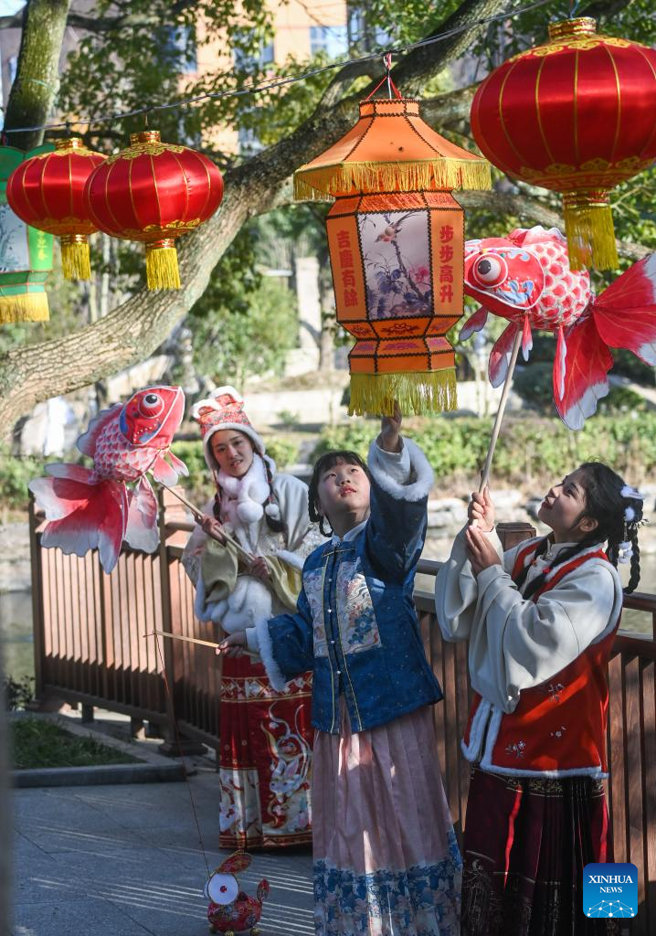 Tourists dressed in traditional Chinese costumes view lanterns at Aoshan Lantern Festival in Xincheng ancient town of Xiuzhou District in Jiaxing, east China's Zhejiang Province, Jan. 29, 2023. The Aoshan Lantern Festival, which has a history of hundreds of years, kicked off here on Sunday. (Xinhua/Xu Yu)