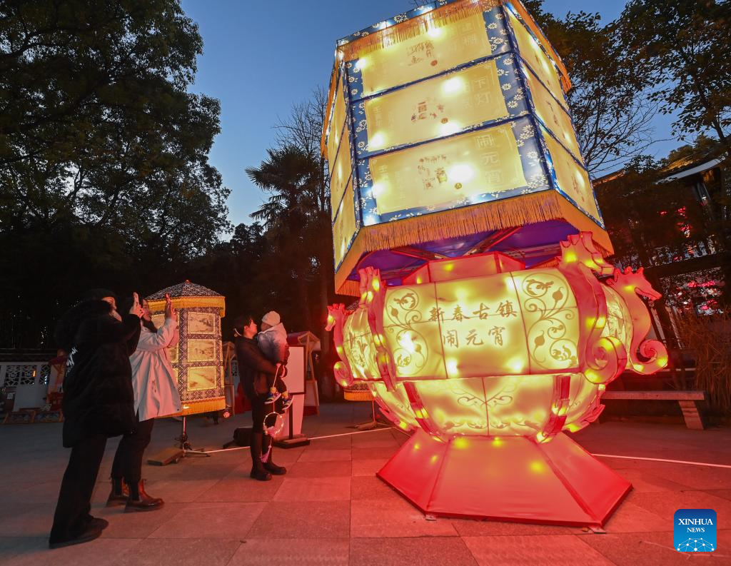 Tourists view lanterns at Aoshan Lantern Festival in Xincheng ancient town of Xiuzhou District in Jiaxing, east China's Zhejiang Province, Jan. 29, 2023. The Aoshan Lantern Festival, which has a history of hundreds of years, kicked off here on Sunday. (Xinhua/Xu Yu)