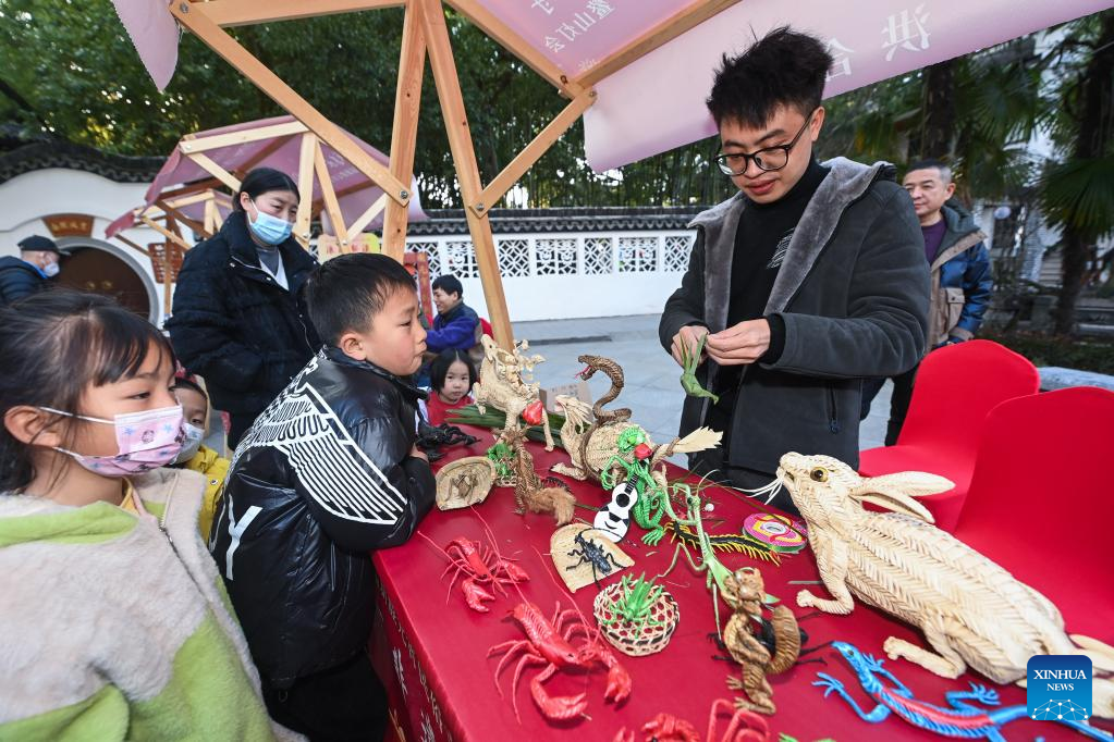 A craftsman shows weaving handicraft at Aoshan Lantern Festival in Xincheng ancient town of Xiuzhou District in Jiaxing, east China's Zhejiang Province, Jan. 29, 2023. The Aoshan Lantern Festival, which has a history of hundreds of years, kicked off here on Sunday. (Xinhua/Xu Yu)
