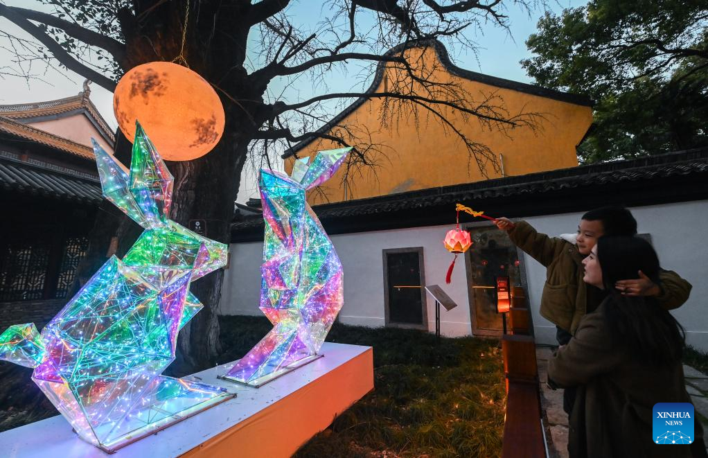 Tourists view rabbit-shaped lanterns at Aoshan Lantern Festival in Xincheng ancient town of Xiuzhou District in Jiaxing, east China's Zhejiang Province, Jan. 29, 2023. The Aoshan Lantern Festival, which has a history of hundreds of years, kicked off here on Sunday. (Xinhua/Xu Yu)