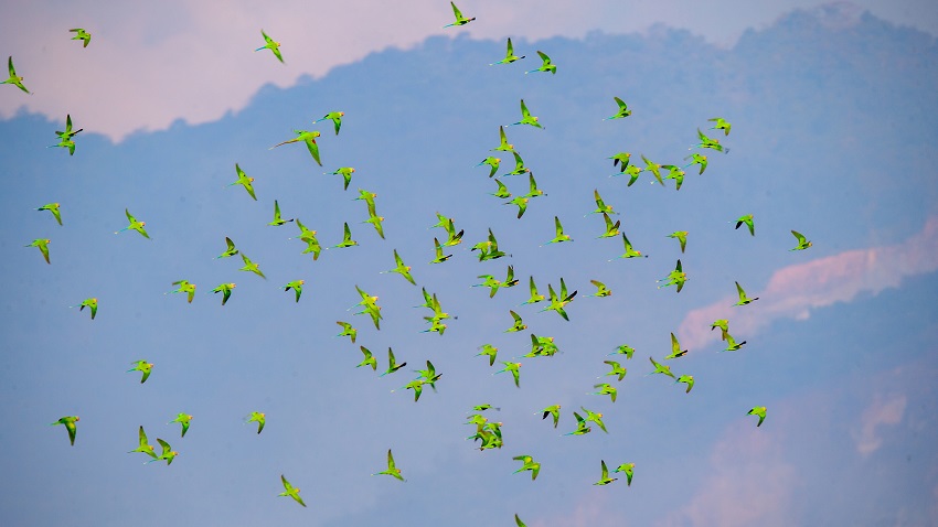 Hundreds of rare blossom-headed parakeets silhouetted against sunset in SW China’s Yunnan (4)