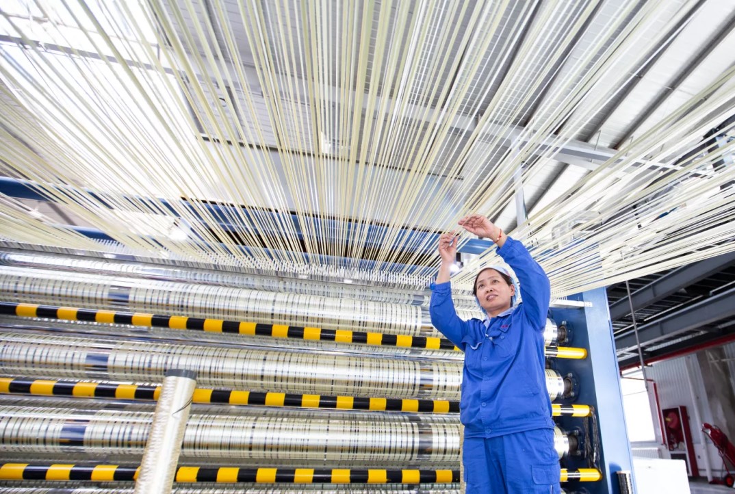An employee of the Xining branch of Zhongfu Shenying, a leading Chinese carbon fiber manufacturer, works in a workshop. (Photo/He Yingli)