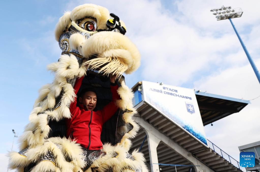 An artist performs lion dance outside the Abbe Deschamps Stadium of Auxerre club before a French Ligue 1 match between Auxerre and Montpellier as part of the Day of China activites to celebrate the Chinese Lunar New Year in Auxerre, France, Jan. 29, 2023. (Xinhua/Gao Jing)