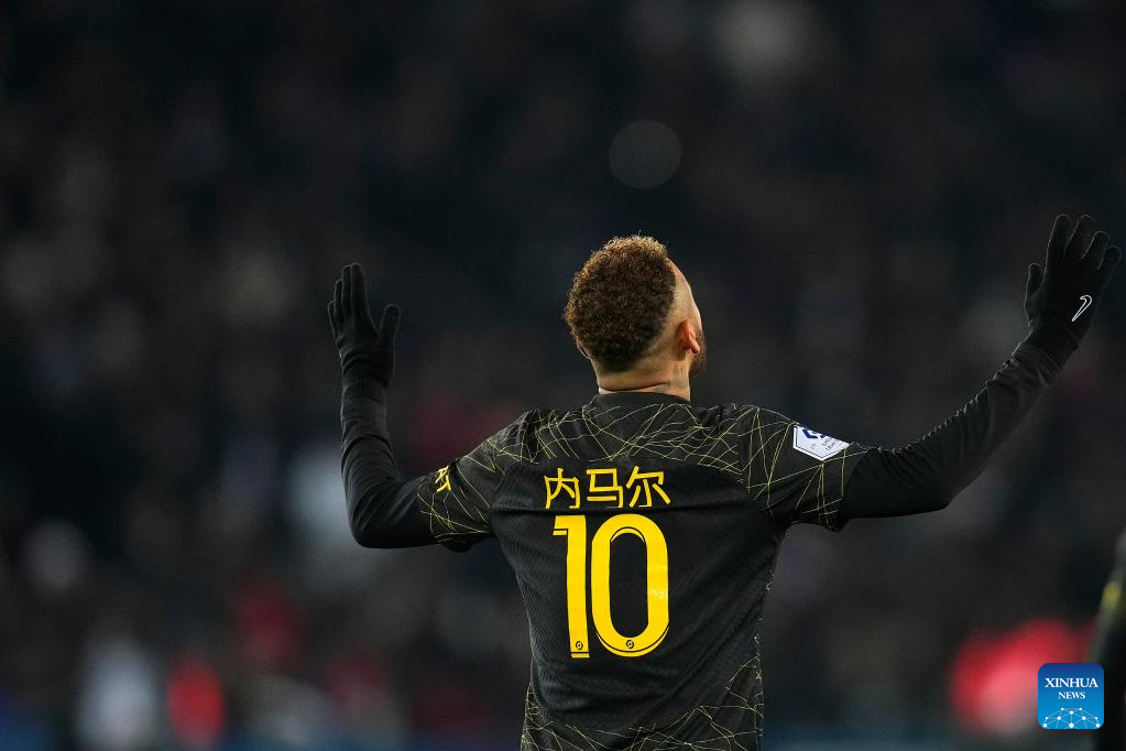 Paris Saint-Germain's Neymar wears a jersey with his name in Chinese during a French Ligue 1 football match between Paris Saint-Germain and Stade de Reims as part of the Day of China activites to celebrate the Chinese Lunar New Year in Paris, France, Jan. 29, 2023. (Photo by Glenn Gervot/Xinhua)
