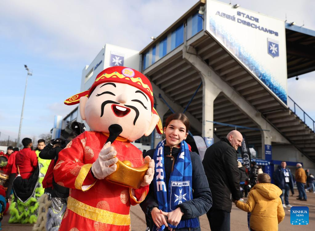 The decoration themed Chinese Spring Festival is seen at the Abbe Deschamps Stadium of Auxerre club before a French Ligue 1 match between Auxerre and Montpellier as part of the Day of China activites to celebrate the Chinese Lunar New Year in Auxerre, France, Jan. 29, 2023. (Xinhua/Gao Jing)