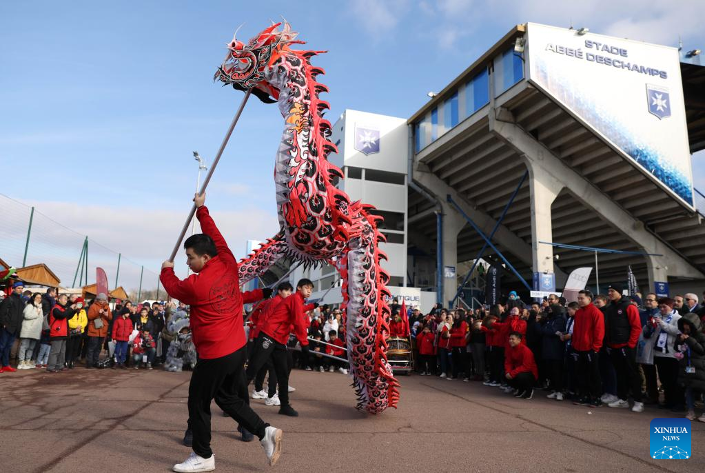 Artists perform dragon dance outside the Abbe Deschamps Stadium of Auxerre club before a French Ligue 1 match between Auxerre and Montpellier as part of the Day of China activites to celebrate the Chinese Lunar New Year in Auxerre, France, Jan. 29, 2023. (Xinhua/Gao Jing)