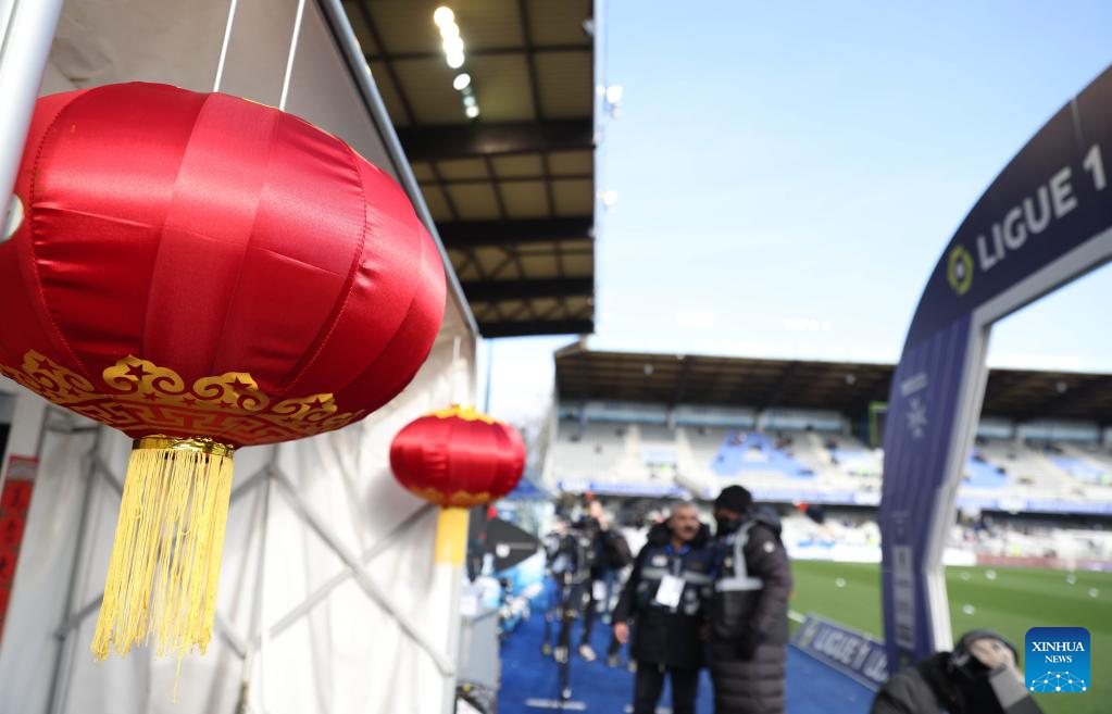Traditional Chinese lanterns are seen at the Abbe Deschamps Stadium of Auxerre club before a French Ligue 1 match between Auxerre and Montpellier as part of the Day of China activites to celebrate the Chinese Lunar New Year in Auxerre, France, Jan. 29, 2023. (Xinhua/Gao Jing)
