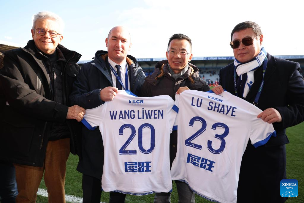 Chinese Ambassador to France Lu Shaye (2nd R) receives jerseys at the Abbe Deschamps Stadium of Auxerre club before a French Ligue 1 match between Auxerre and Montpellier as part of the Day of China activites to celebrate the Chinese Lunar New Year in Auxerre, France, Jan. 29, 2023. (Xinhua/Gao Jing)