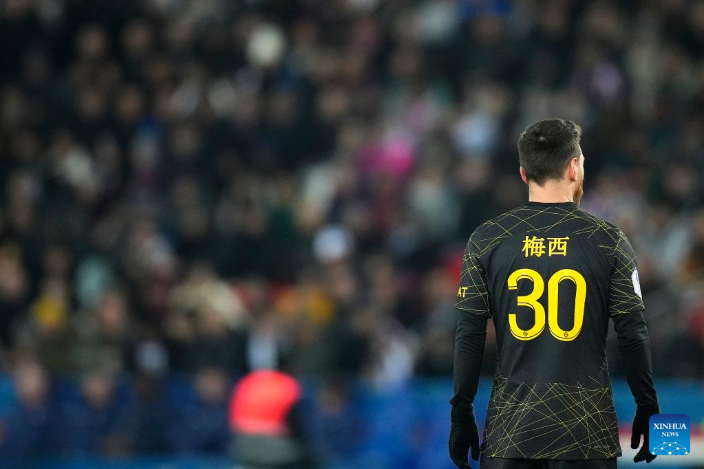 Paris Saint-Germain's Lionel Messi wears a jersey with his name in Chinese during a French Ligue 1 football match between Paris Saint-Germain and Stade de Reims as part of the Day of China activites to celebrate the Chinese Lunar New Year in Paris, France, Jan. 29, 2023. (Photo by Glenn Gervot/Xinhua)