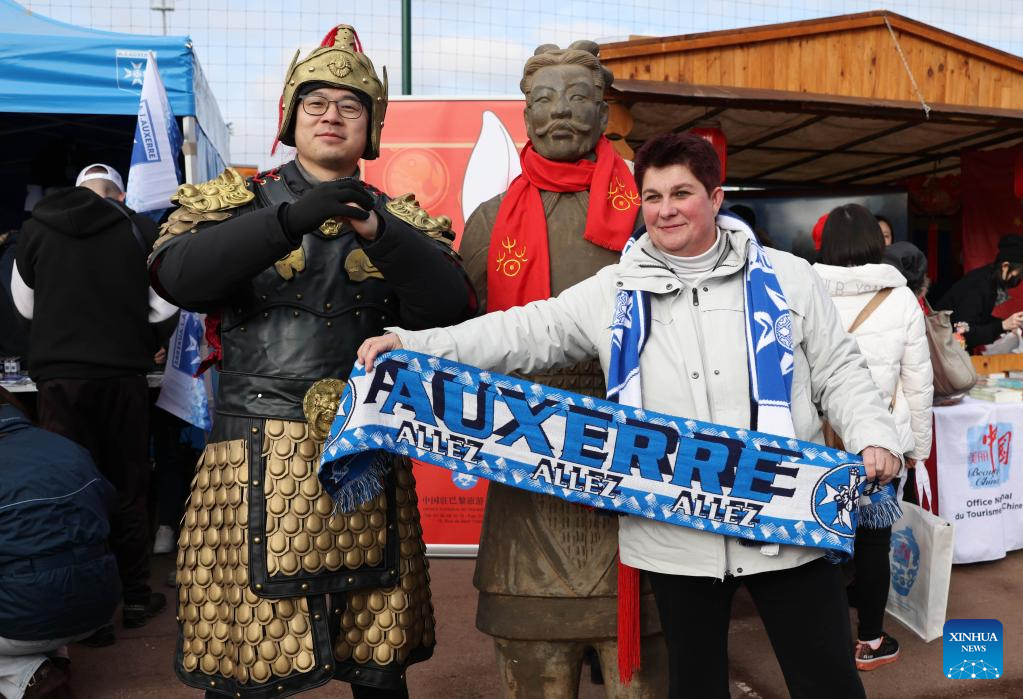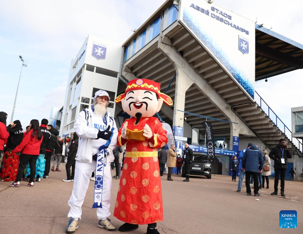 An Auxerre fan poses with staff members outside the Abbe Deschamps Stadium of Auxerre club before a French Ligue 1 match between Auxerre and Montpellier as part of the Day of China activites to celebrate the Chinese Lunar New Year in Auxerre, France, Jan. 29, 2023. (Xinhua/Gao Jing)