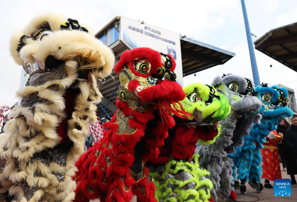 Artists perform lion dance outside the Abbe Deschamps Stadium of Auxerre club before a French Ligue 1 match between Auxerre and Montpellier as part of the Day of China activites to celebrate the Chinese Lunar New Year in Auxerre, France, Jan. 29, 2023. (Xinhua/Gao Jing)