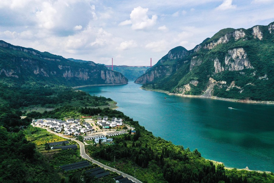 Aerial photo taken on July 24, 2021 shows the view of a relocation site for poverty alleviation at Huawu village in Qianxi city, southwest China's Guizhou Province. (Xinhua/Yang Wenbin)